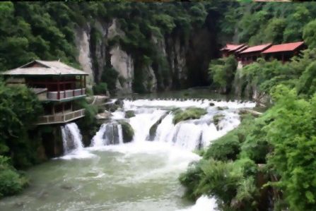 水洞下游有臥龍湖,水清可鑒,湖邊排列著水車、水碾、水磨、“香粑車”等等往時(shí)鄉(xiāng)間常見的農(nóng)家物,給人以既古樸又清新的感覺。與臥龍湖相連的是一處罕見的鈣化灘,足有200米長(zhǎng),灘面上瀑布流瀉,水簾溶洞星羅棋布,植被茂密,堪稱喀斯特景貌的一絕。這一帶,春來(lái)桃花爛漫,夏臨蘭草吐芳,金秋野菊盛開,初冬火棘紅艷,一年四季,風(fēng)景如畫。