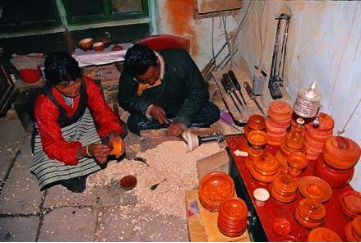 西藏人喝茶,一般都用的是木碗。木碗的用法,很有講究。光景好的人家頓頓喝的是酥油茶,貧寒人家向來靠清茶打發(fā)日子。但是有錢漢也好,窮光蛋也罷,喝茶卻都用木碗。即使有了玉碗和瓷碗,人們?nèi)源骨嘤谀就搿T诩矣盟?,出門也用它,形影不離,浪跡天涯的旅人的懷里都揣著個(gè)木碗,人在碗在,碗不離人。居家過日子,沒有不出門的人。小小一個(gè)木碗,在家有在家的用法,出門有出門的講究。木碗雖小,其俗頗豐。