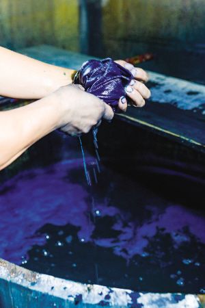 藍(lán)靛染布是一項(xiàng)古老的工藝,是白褲瑤服飾文化的重要組成部分。白褲瑤婦女用藍(lán)靛草來(lái)提取染布用的靛泥,隨時(shí)染藍(lán)、青棉線(xiàn)和青布。縫制衣物的白棉布用藍(lán)靛這種天然染料染色,其色澤與一般的機(jī)織布印染有所不同。2018年8月拍攝。