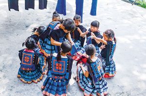 南丹縣瑤族服飾代表性傳承人黎鳳珍在染坊免費(fèi)教授前來(lái)學(xué)習(xí)的小學(xué)生。2018年拍攝。