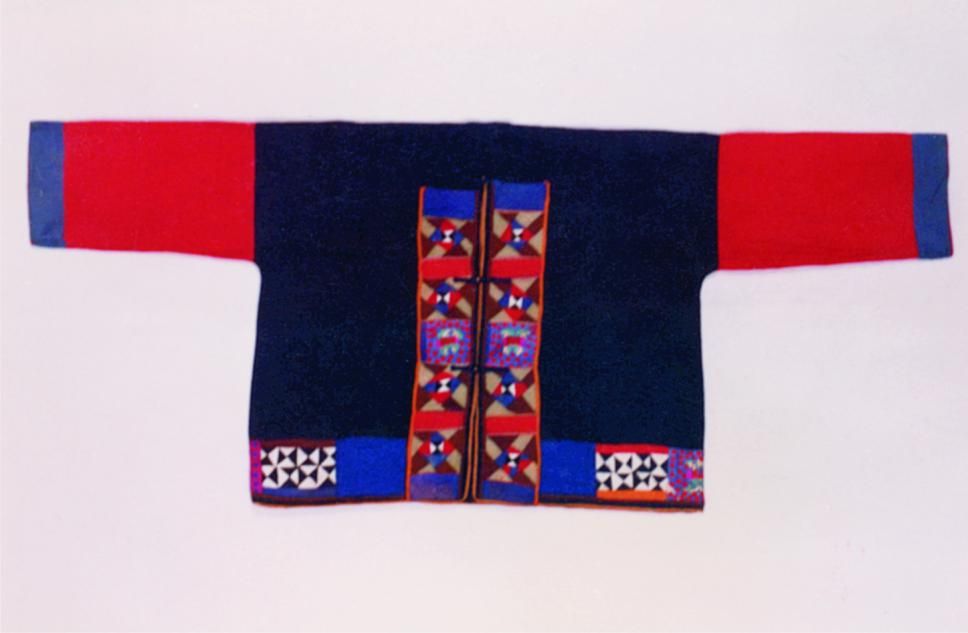 剪花衣又為“縑花衣”,是清末明初阿昌族已婚婦女的一種上衣,主要流行于云南省德宏傣族景頗族自治州梁河縣阿昌族地區(qū)。這種衣服的特點(diǎn)是:毛質(zhì)地,多為深色,長(zhǎng)袖圓領(lǐng)對(duì)襟,釘圓銅扣,前襟和衣服四周均用各種顏色的方形或三角形布片鑲縫成幾何形圖案。中間還夾雜著刺繡花紋圖案。過(guò)去,姑娘出嫁與新郎拜堂和年老去世時(shí)都要穿著剪花衣服。前者表示夫妻白頭偕老,生死不離;后者被認(rèn)為到陰間可以和親人相會(huì)團(tuán)聚。久而久之,穿剪花衣成為阿昌族的特定風(fēng)俗。