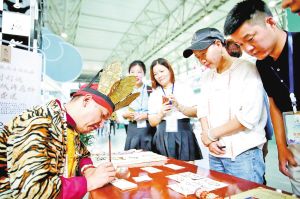 在云南文博會上,來自麗江的納西族東巴文化傳承人現(xiàn)場展示東巴文字的書寫方法。 張彤攝