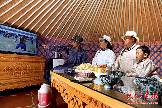 邊境牧區(qū)無線網(wǎng)絡(luò)暢通,阿巴嘎旗牧民伊拉勒圖一家在觀看直播節(jié)目。