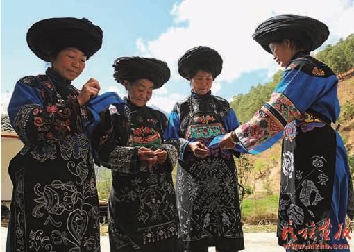 青海土族、四川羌族、云南彝族偏愛(ài)紅色服飾。在云南省楚雄彝族自治州永仁縣的彝族賽裝節(jié)上,婦女們身著紅色刺繡服裝,匯聚成一片紅色的“海洋”;涼山彝族以紅黃黑三色為主色,服飾、漆器、室內(nèi)外裝飾多為這3種顏色;漢藏語(yǔ)系彝語(yǔ)支的彝族、納西族、傈僳族、阿昌族等民族崇尚黑色,在他們的文化中,山水、地名、人名等都能體現(xiàn)尚黑的心理特點(diǎn);白族男女則崇尚白色,在其風(fēng)俗中,白色最為尊貴。
