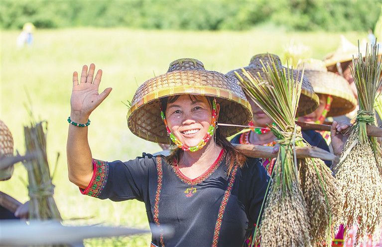 “砍山種植山蘭稻,一定要成功,煮好山蘭米,釀好山蘭酒,邀來(lái)親朋與好友,同慶好豐收……”當(dāng)天,在位于霸王嶺下的青松鄉(xiāng)擁處村的山坡上,一串串飽滿的稻穗已壓彎了稻稈;此時(shí),農(nóng)戶們?nèi)褰Y(jié)伴爬上山坡,弓下腰身麻利地?fù)]動(dòng)著手中的鉤刀開(kāi)割稻稈,在辛勤勞作之時(shí),還不忘哼起黎族歌謠分享著又是一年山蘭好收成的喜悅。山坡上辛勤勞作的喜悅,與正在山腳下舉辦的“啦奧門”山蘭文化節(jié)的喜慶氛圍達(dá)成了同一節(jié)拍。