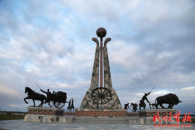 黑河市愛輝區(qū)坤河達斡爾族滿族鄉(xiāng)富拉爾基達斡爾族南遷廣場上的雕塑反映了達斡爾族在黑龍江畔開墾土地,建設家園的情景。
