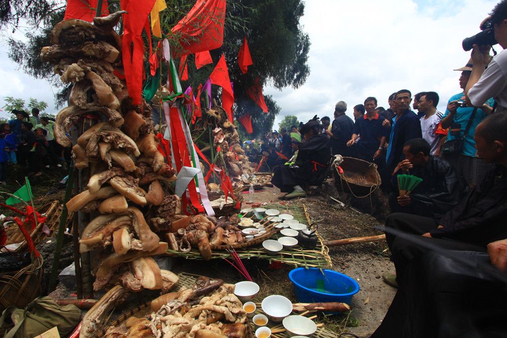 人們傳說只有醉倒了"霞神",它才能永遠留在這方,才能使這里風調(diào)雨順。當水書先生念了最后的咒詞,祭典才在鼓樂聲和歡呼聲中結(jié)束。最后,各族系將祭肉一并聚攏,聚餐慶祝。天黑之后,人們秘密地將"霞神"收藏起來,至此,"敬霞"活動全部結(jié)束。