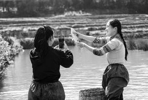 云南紅河哈尼稻作梯田系統(tǒng)被認(rèn)定為全球重要農(nóng)業(yè)文化遺產(chǎn)。圖為當(dāng)?shù)卮迕裨谔萏锱灾辈プヴ~(yú)。 陳欣波攝