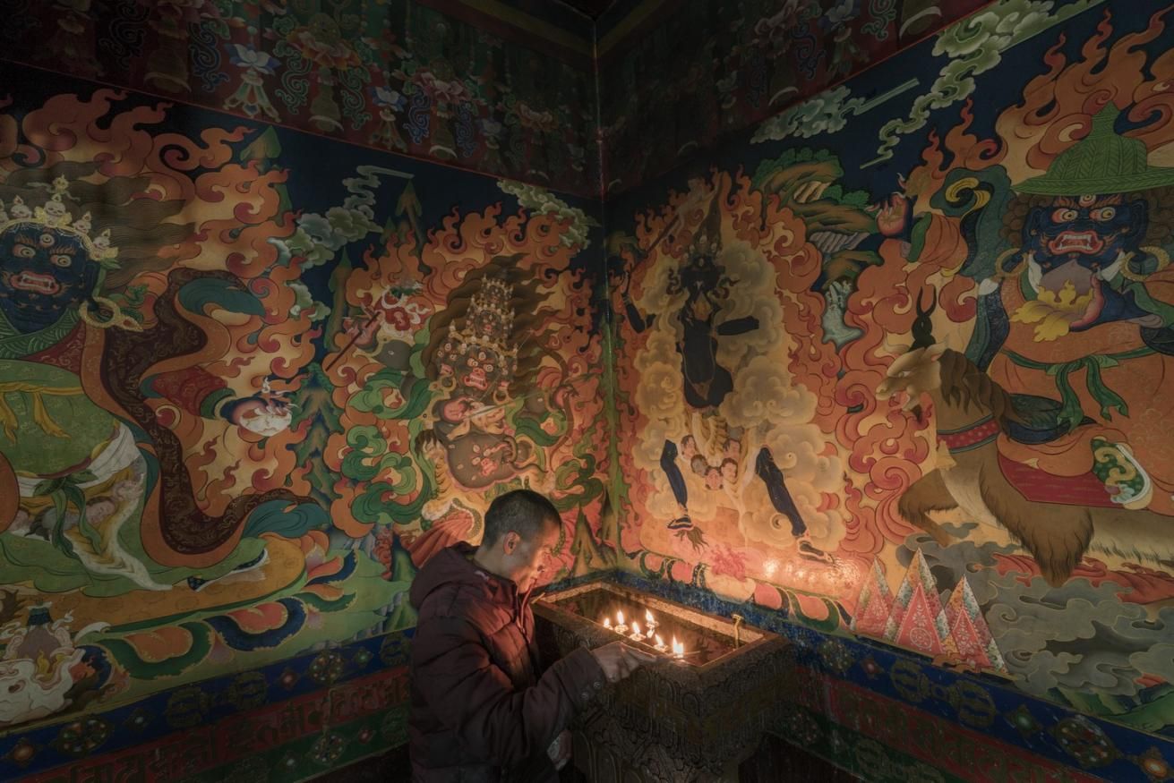 西藏壁畫分布在寺廟、府第、宮殿、民宅、驛站、旅店等地方的墻壁上。而寺院則為壁畫聚集之所,大寺院往往有數(shù)十個(gè)到數(shù)百個(gè)殿堂,各個(gè)殿堂及其周圍走廊的墻壁、天花板等處均繪滿了壁畫,如果把這些壁畫一幅幅地排列起來(lái),那確實(shí)是延綿不斷、絢麗多姿、色彩繽紛的美麗畫廊。