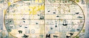 李之藻年輕時就對實學頗感興趣,曾自行繪制過明朝兩京十三省的地圖。見到利瑪竇用西法繪制的世界地圖后,李之藻敏感地意識到,這個地圖的繪制方法與中國傳統(tǒng)的“計里畫方”方法不同,是“取天文以準地度”,用經(jīng)緯度確定地理方位。對利瑪竇的學問一見而傾心的李之藻,每天都要到利瑪竇的公寓學習地理、天文知識,每次都要花上四五個小時。1602年,李之藻與利瑪竇結(jié)合中西繪圖技術(shù),合作繪制了一版世界地圖《坤輿萬國全圖》,這幅地圖改變了當時通行的將歐洲居于地圖中央的西方繪圖格局,把子午線向西移動170度,從而使東亞的中國居于地圖的中央,并且全圖標上了詳細的漢字標識,這是中國最早的世界地圖。