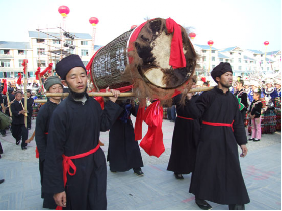 第6天(申日):下午兩三點鐘,保管銅鼓的寨老等人,燒香化紙,燃放鞭炮,用魚、肉、酒等祭鼓后,先由寨老家人踩幾圈銅鼓,然后全寨男女老少及來客(主要為女青年)跟著踩。這天,人人穿著節(jié)日盛裝,在蘆笙的伴奏下,踏著鼓點,圍圈跳蘆笙銅鼓舞。晚夜,本寨和外寨未婚男女青年在河灘等地“游方”,對唱情歌,尋覓伴侶。每天晚上的“游方”活動持續(xù)到第10天(子日)才結(jié)束,這時外寨的男女青年才依依不舍離去。