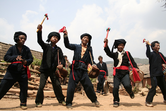 蜂桶鼓舞是布朗族的群眾性舞蹈,分為三步和五步兩種。演出時,由兩名年輕男女雙手各持一條“帕節(jié)”(即毛巾)在前面跳“帕節(jié)舞”引導(dǎo),舞蹈動作主要是甩手巾。其后是蜂桶鼓隊,一般為4—6只,后緊隨2只象腳鼓,之后是6人敲打的大、中、小芒和镲,最后是跟著跳舞的人們和助興的老幼。蜂桶鼓舞的節(jié)奏明快熱烈,幾種打擊樂器相配合,“嘣咚、嘣咚……嘭嚓、嘭嚓……鏘切、鏘切……”,高、中、低音融為一體,獨具情趣。動作大方、瀟灑、粗獷、活潑;舞姿輕盈、柔和、細(xì)膩。大南直布朗蜂桶鼓隊多次被邀赴省城和省外演出,向人們展示了本民族獨特的文化藝術(shù)風(fēng)采。