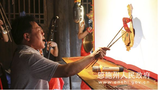 2018年6月10日,省非物質(zhì)文化遺產(chǎn)鶴峰滿堂音傳承人彭文照正在表演滿堂音皮影戲。