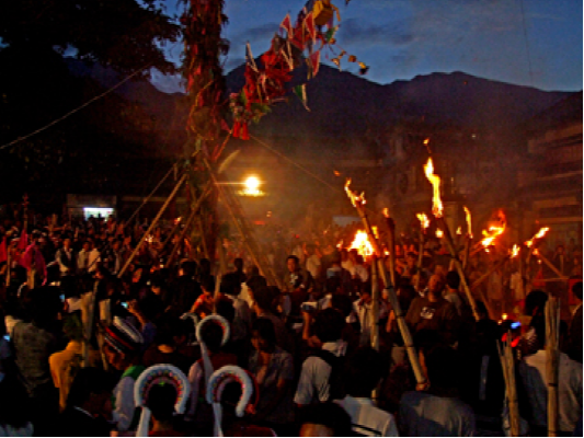 白族視火為生命與靈魂的護(hù)佑物,古有火崇拜習(xí)俗,火把節(jié)是白族對“生之禮贊和死之緬懷的節(jié)日”?;鸢压?jié)這一天,各村由年內(nèi)新添子嗣之家作“會首”,在場壩中豎一高大的火把,常年扎十二臺,潤年扎十三臺,頂端扎升斗旗幟,上書“風(fēng)調(diào)雨順”、“五谷豐登”字樣,下懸花紅、梨子、銅錢等物。天擦黑點燃火把,會首們以糖果、炒蠶豆、煙、茶、酒招待相聚在場壩中的老小。兒童則一手持小火炬,一手往火炬上撥灑松脂粉沐相戲,對新生的嬰兒表示致賀禮贊。與此同日,新亡故者之家人須上墳祭祀,在新故者墳前或大門口豎一小火把,如是者三年,表示對死者的緬懷,與史書“星回日祭祖”的記載相合。