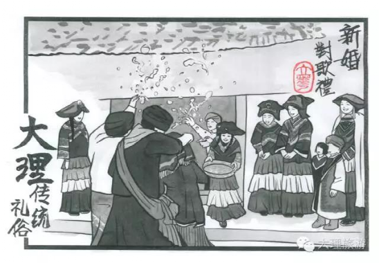 進(jìn)新郎家時(shí),新郎和新娘會(huì)對(duì)歌,新郎問(wèn)新娘答,男女雙方一問(wèn)一答,對(duì)歌后,方能入門(mén)。