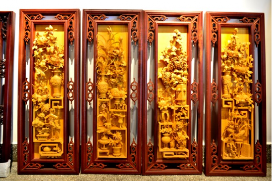 《四條屏掛件》脫胎于“格子門”的上裙板,是由實用到觀賞的一種很好的轉(zhuǎn)換,是目前最走俏的新產(chǎn)品,無論是賓館客廳或居家,古樸典雅的木雕“四條屏”會增添不少東方文化的雅趣,越來越受到人們的喜愛,許多人都把它作為木雕藝術(shù)珍品收藏。為了給世人留下藝術(shù)精品,許多工藝師潛心研究設(shè)計、精心雕刻,用半年、甚至一年多的時間才完成一件“四條屏”。這些精心之作,疏密有致、變化統(tǒng)一,構(gòu)圖飽滿,穿插纏繞,重重疊疊的層層透雕,無不凝聚著制作者的智慧與心血?!端臈l屏》的圖案設(shè)計,主要有三種內(nèi)容:(1)博古;(2)花卉;(3)花鳥。人物、山水類型的極少。圖案喻意與格子門相近。