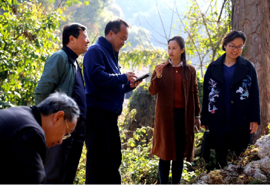 廣南凌婭原生鐵皮石斛科技有限公司董事長周藝暢(右二)給云南社科專家介紹種植鐵皮石斛情況。(蘭天明攝影)