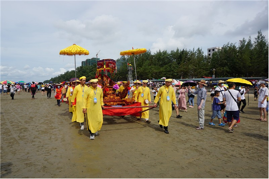 今年適逢中國共產(chǎn)黨成立100周年,活動當天,氵萬尾村洋溢著濃濃的愛國熱情?;顒娱_始,身著京族服飾的當?shù)卮迕駠墼谄鞐U前,舉行升國旗奏國歌儀式。隨后迎神隊伍在鑼鼓和鞭炮聲中到達海邊,將“海神”迎回哈亭敬奉,祈求人畜興旺,五谷豐登(見圖)。眾多慕名而來的區(qū)內(nèi)外游客集聚哈亭和海邊,與京族同胞一起歡慶這盛大的節(jié)日。