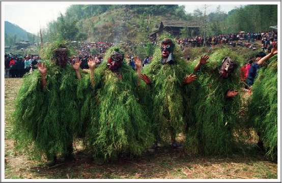 苗族芒篙的固定形象,是面帶古怪的木儺面具,身披齊膝的虎臥藤,手持過頭的竹棍,小腹前掛著長(zhǎng)長(zhǎng)的象征男性生殖器之物,它們單數(shù)組合,多為11——15個(gè)。