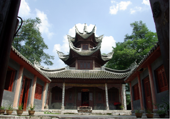冠山,位于貴州龍里冠山盆地(縣城)東隅,巖山形似金鐘撲地,古木參天,蔥郁蒼翠。明永樂(lè)七年(1409)始建的道教活動(dòng)場(chǎng)所掩蔽其中,可謂“山不在高有仙則名”。在歷史的長(zhǎng)河中,雖然道教一去不復(fù)返,但其紫虛觀主體建筑保存尚好,現(xiàn)列為省級(jí)文物保護(hù)單位,由主體建筑紫虛閣、左右?guī)俊⑶暗?、山門(mén)、文昌祠組成二進(jìn)院式古建筑群。主體建筑為木構(gòu)穿斗式三重檐六角攢尖筒瓦頂,1989年遷入的文昌祠,為木構(gòu)抬梁式歇山青瓦頂,帶吻正脊,戧脊翹角卷草,石質(zhì)柱礎(chǔ)浮雕仙草、竹、梅、鹿等圖案。西南兩面有1936年題刻的“還我河山”、“巨靈一孹”等七方摩崖石刻。建筑物的形制、布局給人一種古樸、滄桑之感。登閣騁目,遠(yuǎn)山峻嶺和鱗次櫛比的樓房盡收眼底,讓人流連忘返。