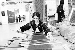 2021年5月,在第六屆全國大學生藝術(shù)展演活動現(xiàn)場,海南師范大學學生展示黎族腰織機織錦技藝。第六屆全國大學生藝術(shù)展演活動組委會供圖