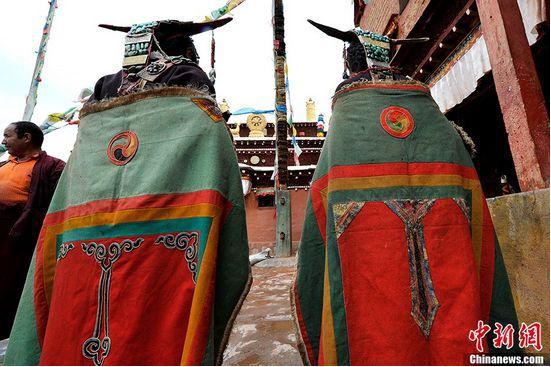 盡管歷史悠久,但它并沒有隨著時(shí)光的流逝和時(shí)代的變遷而被束之高閣,實(shí)際上,即便是今天,這些服飾仍然是當(dāng)?shù)刂匾淖诮袒顒?dòng)中必不可少的內(nèi)容,在科迦寺每年藏歷1月12日大譯師仁青桑布建成108座殿堂和寺廟的慶功紀(jì)念日上,科迦村有這套服飾的7戶家庭的婦女都要穿上這套服飾在科迦寺僧人跳神舞的間隙表演宣舞。