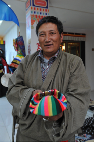 在自治區(qū)群藝館的展出現(xiàn)場(chǎng),除卻這些光鮮亮麗的民族服裝之外,另一個(gè)特殊群體也同樣吸引了眾人的目光,他們便是從西藏各個(gè)地區(qū)前來為觀眾展示藏裝制作工藝的民間手工藝人。他們有的在織布,有的在裁剪,有的在穿針引線做靴子、縫制衣服,這些數(shù)以萬計(jì)的、平凡而又偉大的民間手工藝人們,用他們幾十年如一日的堅(jiān)守,默默地承擔(dān)著民族文化創(chuàng)新與傳承的歷史使命。