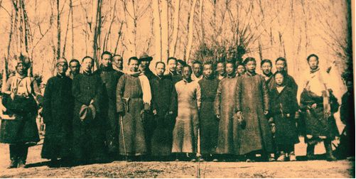 1948年,拉薩小學(xué)校長邢肅芝(左起第七腰間佩槍者)應(yīng)邀赴尼泊爾訪問前與學(xué)校教職員及部分家長合影留念