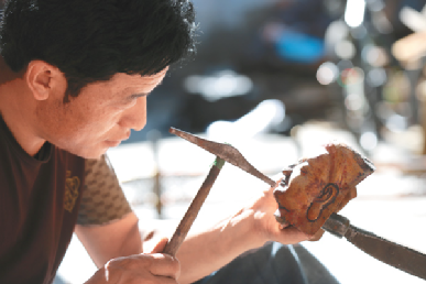 20歲前的次嘎已可以承接一些佛像的鍛敲任務(wù),掌握的技術(shù)遠(yuǎn)遠(yuǎn)超出一起學(xué)習(xí)的其他學(xué)徒們。從鍛敲佛像的蓮花底座、焊接,再到鍛敲銅佛造像上半身、下半身,再到慢慢地開始做些佛像飾物。偶爾,次嘎也能涉獵造像的臉部。這是一個(gè)造像師手藝達(dá)到最好時(shí)才可以觸及的部位?!懊娌拷Y(jié)構(gòu)復(fù)雜又微妙,面部表情的刻畫更是難上加難。作為一個(gè)造像師,這是最考驗(yàn)功力的地方,每一次敲打都在決定作品的成敗?!贝胃抡f(shuō)道。