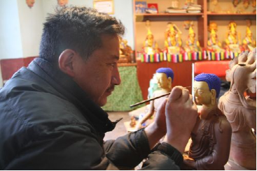據(jù)普布次仁介紹,這些制作精美的手工藝品都出自邊巴之手,今年43歲的邊巴已經(jīng)有20多年的制作經(jīng)驗(yàn),應(yīng)該可以算是泥塑手工技藝?yán)锏馁摺.?dāng)向邊巴說(shuō)明來(lái)意后,這個(gè)藏族漢子反而顯得有些靦腆,邊巴說(shuō):“我從小就對(duì)傳統(tǒng)手工藝很感興趣,家人就專門找了師父讓我去學(xué)習(xí),剛開(kāi)始就學(xué)一些彩繪技巧,包括如何上色、構(gòu)圖等,后來(lái)接觸到了泥塑技藝,我就逐漸迷上了它,這一晃20多年過(guò)去了?!?/p>
