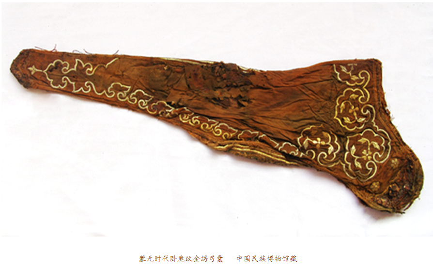 中國民族博物館館藏的臥鹿紋金繡弓囊通長72CM,最寬處25CM,最窄處6.5CM。面料為絹地,呈深褐色。專家推斷其入土前應(yīng)內(nèi)襯樺樹皮或獸皮類框架。弓囊正面以銀裹金錢繡滿圖案,整體金碧輝煌。由于埋藏地下數(shù)百年,弓囊兩端的鐵質(zhì)穿環(huán)和皮條已銹蝕腐爛。
