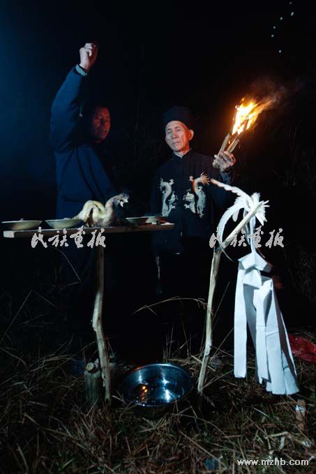 到招龍儀式活動點時,已是凌晨五點半,我們所在的位置是一個山腰,有一個小壩子。我發(fā)現(xiàn)參加儀式的只有十二三個人,就好奇地問:“為什么只來十多個人?”原來這些人是選出來的代表,該村有7個村民小組,共203戶,有980多人口,每次招龍大喜時,要從村民中推選出12位作為招龍代表,從頭到尾主持一切事務。說話間,村里人就開始忙著生火,或準備各項招龍工作。他們用木板支起一個擺放祭品的臺板,擺上祭品。接著,在招龍師傅的主持下,儀式正式開始。第一個程序是“喊白虎龍”,苗家稱為“共階夸羊捌”,師傅拿著一個白公雞,進行一番念誦后宰殺掉,等雞煮熟后再擺上祭臺。