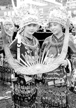 這款流傳在貴州省清水江上游苗族聚居區(qū)的傳統(tǒng)銀角,源出于“蚩尤之角”。兩只角各盤著一條浮雕龍,兩龍相對形成二龍戲珠之勢。中心“珠”的圖案為銅鼓面,銅鼓是苗族傳統(tǒng)的法器。13張銀片為水稻葉子。整體造型為水牛角,水牛是苗族的兄弟、伙伴。