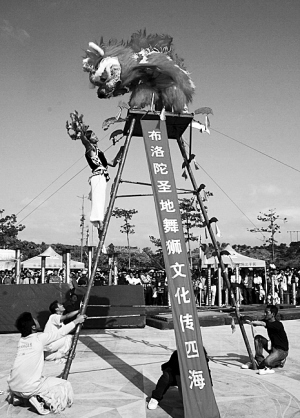 獅子過天橋、刀尖獅技、高樁飛獅……一只只威風(fēng)凜凜的“獅子”在高臺或梅花樁上騰挪跳躍,它們時而回首擺尾,時而單腿直立,時而臥居山川,時而沖向九霄,甚至還會沖觀眾眨眼吐舌,憨態(tài)可掬,惟妙惟肖。整個場面既驚險又有趣,讓大批駐足觀看的游客大開眼界……