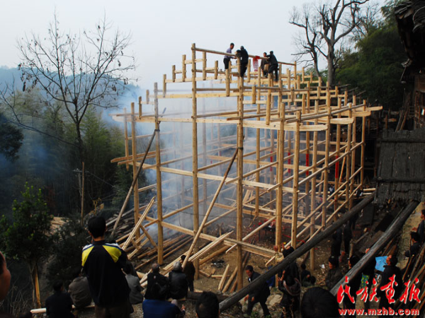 干欄式建筑是生活在“南嶺走廊”之貴州、廣西、廣東、湖南等地的布依族、苗族、瑤族、侗族等少數(shù)民族共有的民居樣式。圖為干欄式建筑的骨架結(jié)構(gòu)。楊昌銀攝影,引自民族畫報