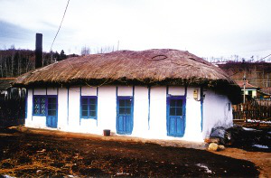 水稻的大面積種植提供了充足的稻草,它們可用于紡草繩、苫屋頂。因此,苫蓋稻草的屋頂也是朝鮮族民居的特色。四面墻壁很薄,中間立木柱,兩面釘薄板或綁扎秫秸,以草泥抹平,刷白灰。每個窗、門兩側(cè)依木柱成框,并刷藍(lán)色,后墻只留一門,不設(shè)窗。間壁墻上架柁,柁上搭檁木、鋪椽子,再鋪秫秸,鏝一層黃泥,即成屋頂。從屋頂四周。