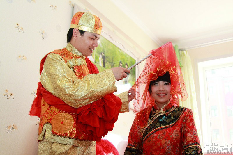 滿族傳統(tǒng)婚姻儀式較為復(fù)雜,大致經(jīng)過通媒、放定、納彩、過箱、迎親、拜堂、拜祖、分大小、回門和住對月一整套過程。通媒即由男方家請媒人向女方家求婚,兩家都同意后便放定,即男方家贈如意或釵釧諸物為定禮。然后是定婚,即選擇吉日,男方家及其親戚往女家問名,女家設(shè)宴款待,男方家長致辭求婚,女方家則推謝再三,男方家堅持求婚,女方家同意后,才算定下婚事。此時男方要拜女方家神位及其長輩。定婚后要過禮,也是選擇吉日,男方家送衣服、綢緞、羊、鵝等禮物。男方家還要贈銀兩錢財。此時要議定婚期。進入迎親階段,女方家在婚期前一天陪送嫁妝,俗稱“過箱”,新郎要往女家致謝。迎親時,新郎在迎親隊伍的陪伴下趕著彩車迎親,在途中兩車相錯時,新娘的哥哥將新娘抱上新郎家的彩車,俗稱“插車”(由于各地滿族風(fēng)俗不同,也有新郎與迎新隊伍直接到新娘家迎親的。還有的地方有“旗俗不親迎”之說)。新娘至新郎家,換車乘轎,花轎落地,新郎要虛射三箭。新娘蒙紅蓋頭下轎,與新郎站在事先擺在院中的天地桌前,向北三叩首,俗稱拜北斗,即拜天地。拜完后撤天地桌,新娘進入臨時搭的帳篷,謂之坐帳(也稱“坐?!保?。坐帳時“開臉”,換頭型。坐帳后,新娘跨過馬鞍進洞房,新郎用秤桿揭去蓋頭扔到房檐上。晚間在地上放一桌子,桌上放兩個酒壺和酒盅,新郎新娘手挽手,繞桌子三圈后飲交杯酒,吃“合喜面”“子孫餑餑”,眾人鬧洞房,唱喜歌,名曰“拉空家”(或有人用黑豆往新房窗戶上撒,熱鬧一兩個小時后自散)?;閼c當(dāng)晚,新郎新娘當(dāng)然要拜祖宗,炕上點燃一對蠟燭,通宵不熄?;楹蟮谝惶?,新娘給夫家親戚裝煙敬茶,拜宗族,認(rèn)明輩分,謂之“分大小”。三日后新郎新娘回娘家,拜見娘家人并拜祖宗?;楹笠粋€月,新娘回娘家住一個月,謂之“住對月”。至此,婚娶儀禮乃告結(jié)束(下圖引自廣西汽車論壇)。