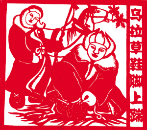 此外,撫順滿族剪紙在畫面上還經(jīng)常結(jié)合滿文,使不同的人物、情節(jié)都凝固于畫面,豐富了作品的敘事內(nèi)容。這種圖文并茂的剪紙造型,也是其一大亮點。