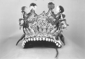 繡花帽由里外兩部分組成,素有“制做繡花帽,先做好襯套”之說(shuō)。即先按兒童頭徑大小制襯套,做法較簡(jiǎn)單,用染過(guò)的家織布做里襯,鋪上薄棉,外層為紅綢面,用線依次納緊,以防棉花下滑,縫成筒狀后,頂部用同樣的材料剪成四方形,與上部帽沿結(jié)構(gòu)相同即成。后部分較前部分復(fù)雜,先將染過(guò)的兩層家織布粘牢,表面貼上各色緞面,顏色自定。把圖樣拓在緞面上,剪下形狀不同的6片材料,把喜愛(ài)的圖案描繪在上面,接著用紡車紡出6根各4米長(zhǎng)的棉線,用吊砣逐根旋轉(zhuǎn)纏繞白色呢絨線,經(jīng)濃縮,每根僅得到1米左右線料,將這制好的精線按圖案盤弄,后以花針固定,再輔以其他色線刺繡成圖案點(diǎn)綴其間。把繡好的6片材料組合到襯套上,各片邊沿用黑白兩色線交替鎖邊,帽口用黑金絨布滾邊。此時(shí),帽頂?shù)模吨患饨怯貌噬€制做成圓球裝飾,外面四角下面懸吊白色珍珠串,末端垂著布制五角星。帽的周邊釘上銀制品,最后鑲上反光小圓點(diǎn)飾物似天上星星般光亮,給本就精致美觀的繡花帽增添了一道靚麗色彩,繡花帽就這樣在侗家女的手中誕生了。