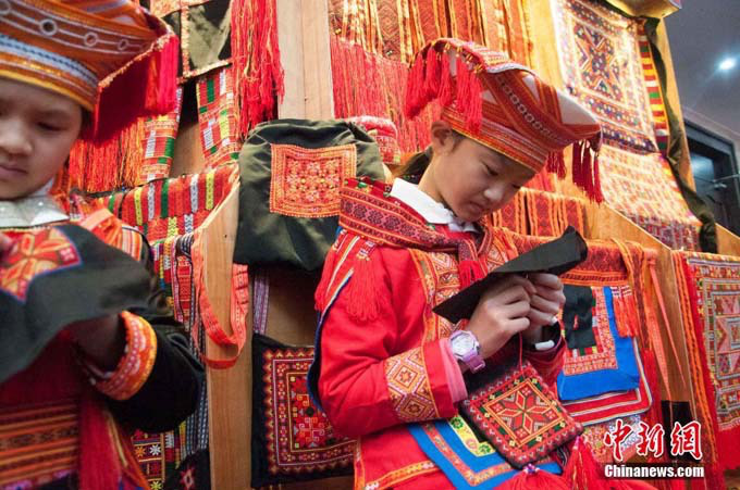 12月6日,在中國瑤族之鄉(xiāng)廣西金秀瑤族自治縣的盤王節(jié)上,當地新一輩瑤族女孩展示瑤族織繡