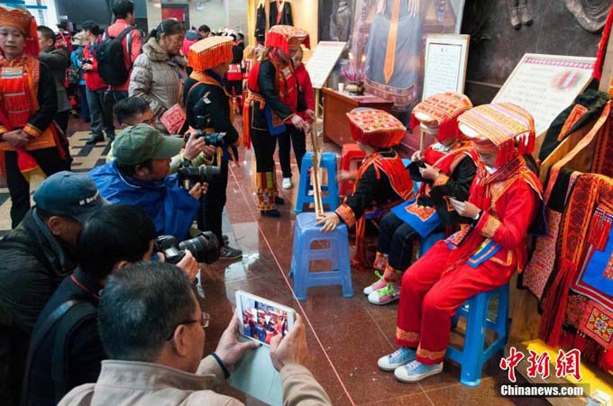 12月6日,在中國瑤族之鄉(xiāng)廣西金秀瑤族自治縣的盤王節(jié)上,當地老一輩瑤族婦女展示瑤族織繡