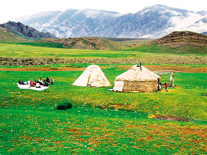 氈房外觀通常樸實無華,門框由松木做成,上面雕刻花紋或繪制圖案,一塊鮮艷奪目的掛毯吊在門上。房內(nèi)富麗堂皇,布置合理,前半部分堆放日用物品,后半部分待客、住人。