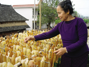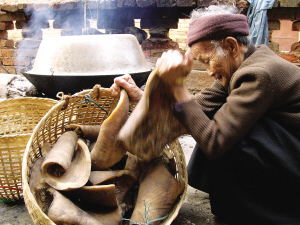 據(jù)曼滿村的傣族老人介紹,制作泡牛皮的材料是水牛皮,黃牛皮太薄是不行的。水牛皮買回家后,第一道工序是去毛。將牛皮用沸水燙后,刮盡上面的牛毛,剔掉附著的筋肉,再將牛皮煮至用竹筷稍用力可穿透為止。第二道工序是晾涼,刮去牛皮的上下兩層,將中間一層純皮切成長10厘米、寬1至2厘米的條狀,然后,將其曬成干品,放進(jìn)60℃左右的油鍋內(nèi)浸泡24小時,撈出,濾油曬干,供油炸用。要吃的時候,把曬干的條狀牛皮放入熱油鍋中,文火加熱,直至牛皮像油條一樣發(fā)泡、微黃時,取出食用即可。