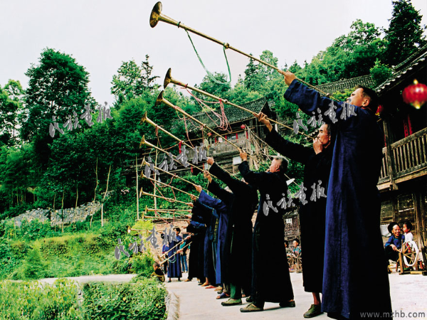 水族的民間音樂有其獨(dú)特的民族風(fēng)格,尤其是民歌,形式多樣。水族民歌按其形式可分為單歌、雙歌、蔸歌、調(diào)歌、詰歌等;按其內(nèi)容則可分為古歌、頌歌、生產(chǎn)歌、風(fēng)物歌、風(fēng)俗歌、酒歌、情歌等類別。雙歌是水歌中最富有特色的一種說唱形式。雙歌以組為單位,分歌前的說白和主體的吟唱兩部分。雙歌,尤其是寓言性的雙歌,十分幽默、風(fēng)趣,寓意不直接表露,必須根據(jù)當(dāng)時(shí)演唱?dú)夥战Y(jié)合歌的內(nèi)容去揣摩。水族情歌按照從相會(huì)到結(jié)婚整個(gè)戀愛過程來分,可分為:青春歌、惜春歌、見面歌、分別歌、約會(huì)歌、求愛歌、想念歌、定婚歌,也有一部分反映婚姻不能自主的苦情歌、分離歌、逃婚歌。按照對(duì)酒歌內(nèi)容的理解,水族酒歌分為兩種:一是歌曲內(nèi)容與酒有關(guān)的歌,如釀酒歌、敬酒歌等;二是喝酒時(shí)唱的歌。水族民歌的特點(diǎn)是曲調(diào)變化不大,旋律較為簡約,但歌詞常因時(shí)因事因人而不斷充實(shí)新的內(nèi)容,以抒發(fā)自己的感情。