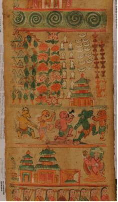 納西族東巴教的長幅布卷畫,通稱為“神路圖”,它是東巴教繪畫中的巨作。此類畫一般長10-20米,寬1尺左右,有“古代宗教繪畫第一長卷”之譽(yù)。文化內(nèi)涵異常豐富,在國際學(xué)術(shù)界被視為宗教繪畫一絕。如今,此畫已成稀有之物。很少見到尚留存民間的神路圖了?!吧衤贰敝鉃闁|巴為死者評(píng)斷、指點(diǎn)通往神地之路,把他們從地獄的煎熬中解脫超度出來,轉(zhuǎn)生為人,送至神靈之地。在納西族的喪葬和超度亡靈儀式上,根據(jù)神路圖導(dǎo)引死者靈魂進(jìn)入新的生命場(chǎng)是一件極為重要的大事。到時(shí),要把神路圖展開,眾東巴站于圖旁依次詠誦8冊(cè)《神路圖經(jīng)》,為死者評(píng)斷路徑,導(dǎo)引亡靈穿越鬼地;擺脫惡鬼的種種折磨。在納西族實(shí)行傳統(tǒng)安葬習(xí)俗時(shí),要在安葬場(chǎng)鋪開神路圖,把圖上的鬼地部分朝著死者頭部,向東北方向鋪開。往東北方向鋪的意思是死者靈魂將回歸東北方向的納西遠(yuǎn)祖之地。把死者靈魂送到“祖先之地”是納西族的古代民俗。各地納西族都有十分詳細(xì)的送魂路線,靈魂返祖地必經(jīng)的每一個(gè)地名都在口傳和寫于東巴經(jīng)的送魂路線中標(biāo)出。其畫面所繪鬼神人三界有數(shù)百個(gè)人神鬼獸的形象和很多具有宗教象征意義的物象,有佛像、神像、各種動(dòng)物神,七八十個(gè)奇禽異獸以及東巴跳神的舞蹈布局,畫卷內(nèi)容以靈魂不滅,因果報(bào)應(yīng),生死輪回等佛教信條為指導(dǎo),用連續(xù)性和富有戲劇性的畫面表現(xiàn)人死后亡魂不滅。