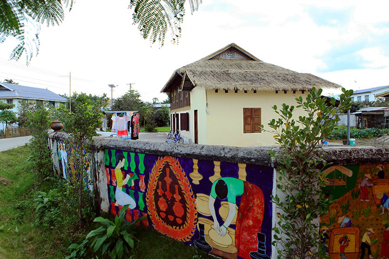 吞也指著家里客廳墻上的畫對我說:“畫中描繪的是我記憶中的故鄉(xiāng),一些古老的生活環(huán)境和生產(chǎn)方式,我想將這些逝去的生活記錄下來?!眽ι蠏熘牟粌H有吞也的畫作,還有一些瑞麗其他農(nóng)民畫師、畫家們的作品。2011年,在文化惠民政策和鄉(xiāng)村旅游開發(fā)的帶動下,瑞麗市在喊沙寨設(shè)立了農(nóng)民畫展室,目的是給農(nóng)民畫營造一個原生態(tài)的展示環(huán)境。