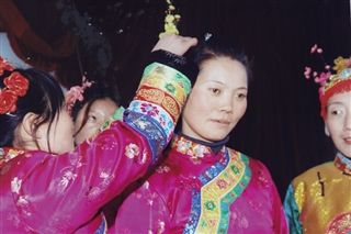 到了預(yù)定的時(shí)辰,新娘該“上馬”了。阿姑們將娶親人的馬鞍等物藏起來(lái),并圍著馬頭唱起了《上馬曲》,悲傷的詞曲中阿姑們向即將出嫁的新娘一一道別,對(duì)娶親者提出種種要求,只有具備這些條件,新娘才能上馬:
