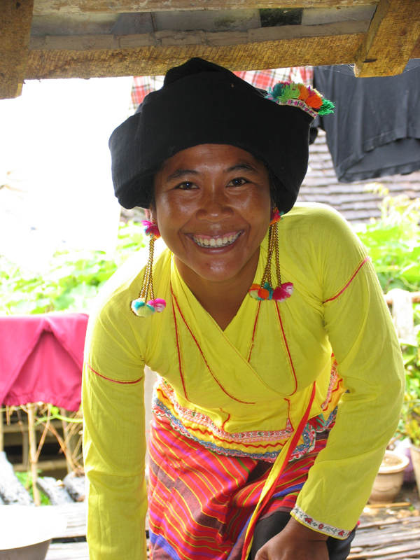婦女的衣裙與傣族相似,上穿緊身短衣,頭頂挽髻,用頭巾纏頭,喜歡戴大耳環(huán)、銀手鐲等裝飾。姑娘愛戴野花或自編的彩花,將雙頰染紅。一般,女子上著左右兩祚斜襟窄袖黑色小褂,小褂為圓領(lǐng)、緊腰、寬擺,短及臀部,在左肋下拴線打結(jié),已婚婦女用黑色布料,未婚姑娘喜淺藍色或白色。里衫為無袖貼身夾衫,下穿兩條筒裙,內(nèi)裙為白色,外裙有兩色,臀部以上為紅色橫條,腿下為綠色或黑色,用布條或花邊鑲飾。未婚婦女用黑或藍布包頭;已婚婦女梳發(fā)髻,插銀簪,頂端鑲3顆棱形玻璃珠,下系銀鏈,纏包頭。婦女戴銀耳環(huán)、項圈、手鐲等飾品。