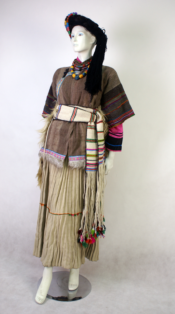 普米族婦女的上衣為黑色、蘭色、白色的開襟短衣,和男子基本一樣,但袖口有花邊,領(lǐng)口用花線繡上吉祥的圖案。下身著百褶筒裙,裙腳邊加一圈紅線,裙襠口加一圈白色厚布,裙腳寬大,縫成褶皺形狀,一般需布匹二丈多。腰間系一根彩帶,彩帶多用山麻或羊毛捻線織成。日常生產(chǎn)生活中,普米族婦女喜歡穿羊皮褂,皮褂有兩種,一種是有袖子的開衫皮褂,一種是不作任何加工縫制的披肩皮褂,一般多用披肩皮褂。青年婦女均穿短上衣,古代是用麻制的,現(xiàn)代大多用棉布;過去多喜歡白色,現(xiàn)在喜用白黑紅等多種顏色;右面開襟,下襟較短,窄袖高領(lǐng)。春天她們穿用條絨縫制、領(lǐng)和衣邊鑲嵌金銀邊的夾衣,稱金邊衣服。