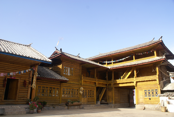 普米族的村落一般建在有松林的半山緩坡地帶,通常二三十戶為一村,村寨之間距離很近,可以炊煙相望,雞犬相聞。住房多為木結(jié)構(gòu),墻壁用直徑12厘米左右圓木重疊垛成,木板鋪成人字形雙斜面屋頂,屋頂木板可拉動的兩塊又稱“滑板”,四角豎圓柱,中央立一根大方柱,叫“擎天柱”,認(rèn)為是神靈所在的地方。這種住宅當(dāng)?shù)厮追Q“木楞房”或“木壘子”。